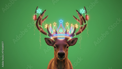 Fototapeta premium A festive deer adorned with a colorful crown of lights, set against a vibrant green background, representing celebration and joy.