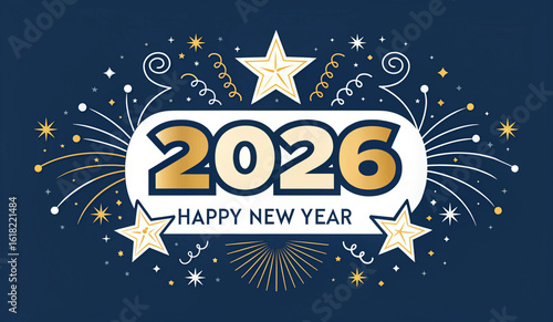 © Shazmeen, Naklejka premium A festive digital graphic featuring the year 2026 in large, bold, yellow text, surrounded by colorful fireworks and stars. The words Happy New Year are displayed in smaller text below the year, all se