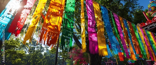 Fototapeta premium A festive display of colorful streamers and banners hanging in a park,...