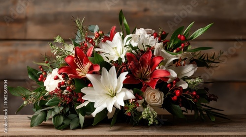© JoxyAimages, Fototapeta premium A festive floral display featuring striking red and white lilies accented by greenery and berries, perfect for holiday decorations, evoking joy and celebration.