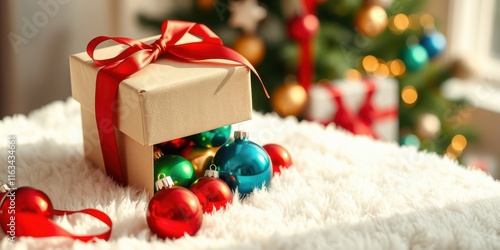 Obraz premium A Festive Gift Box Overflowing with Colorful Holiday Ornaments on a Soft...