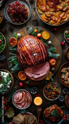 Fototapeta premium A festive holiday dining table set with ham and traditional side dishes for a celebration