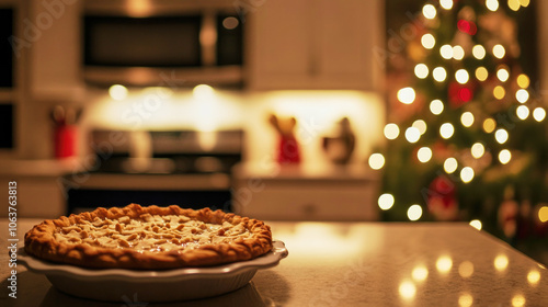 Fototapeta premium A festive kitchen with a Christmas pie and twinkling holiday lights in the background