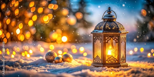 © Alice, Fototapeta premium A festive lantern with ornaments and glowing lights in a snowy winter landscape with bokeh background 32k resolution