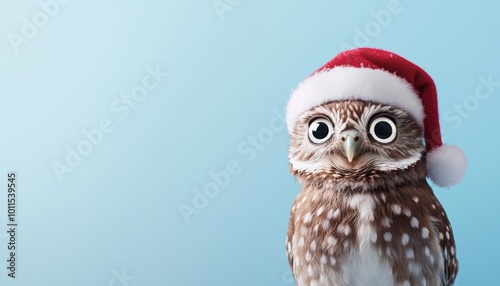 © Wimon, Naklejka premium A festive little owl with big, wide eyes, wearing a cute Santa hat, perched against a soft blue-to-white gradient background, perfect for a wintery holiday feel.