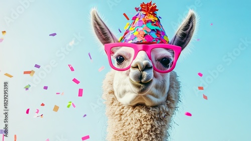 © adobestocker1, Obraz premium A festive llama with pink glasses, wearing a cap with colored confetti on top, smiling. .