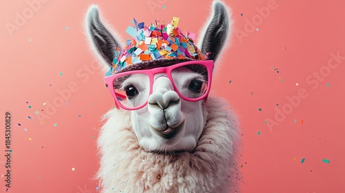 © Igor, Obraz premium A festive llama with pink glasses, wearing a cap with colored confetti on top, smiling. .