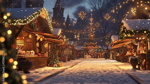 © Benjarin, Obraz premium A festive market scene illuminated by holiday lights and decorations.