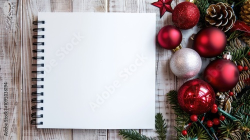 © Alla, Obraz premium A festive notebook with holiday decorations on a wooden table, great for Christmas-themed projects