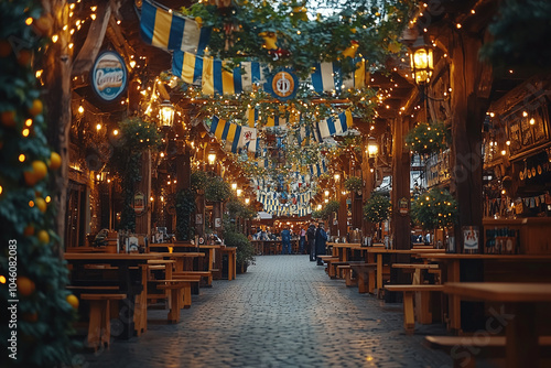 Fototapeta premium A festive Oktoberfest beer tent decorated with Bavarian flags and banners.