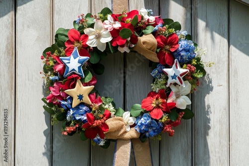 © SUCCESS HOLDINGS, Naklejka premium A festive patriotic wreath with red, white, and blue flowers, ceramic star ornaments, and burlap accents, set against a rustic wooden background, celebrating Independence Day with style and elegance.