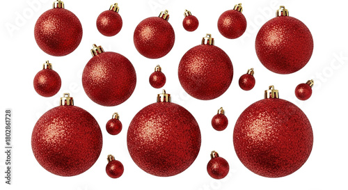 Fototapeta premium A festive pattern of sparkling red glitter Christmas baubles of various sizes...