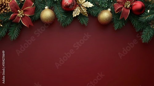 © Diffin, Obraz premium A festive scene brimming with vibrant Christmas decorations, featuring sparkling red bows and natural pine cones against a cheerful red backdrop.