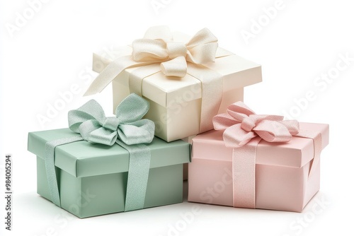 © Vooglo.com, Obraz premium A festive set of 4 gift boxes, wrapped in pastel-colored paper with bows,