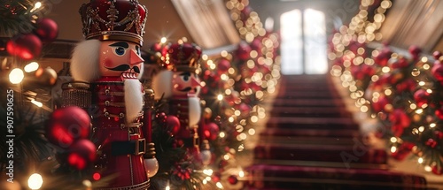 Naklejka premium A festive staircase adorned with nutcracker soldiers, sparkling lights, and...