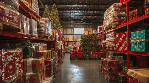 Naklejka premium A festive storage warehouse packed with holiday wrapping supplies.