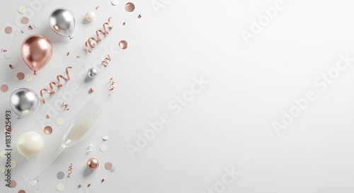 © An, Fototapeta premium A festive table setting with balloons, confetti, and a champagne flute on a white background.