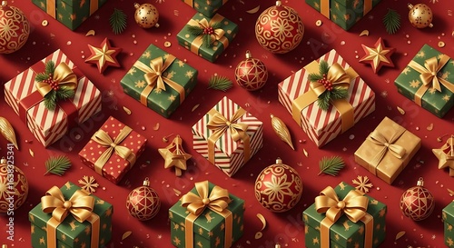 Fototapeta premium A Festive Tapestry of Red and Green Christmas Gifts with Golden Bows and Ornaments.