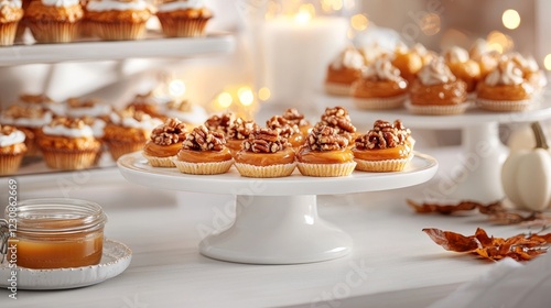 Naklejka premium A festive Thanksgiving dessert table with pecan and maple cookies, mini pumpkin tarts, and caramel sauce, lit with soft natural light