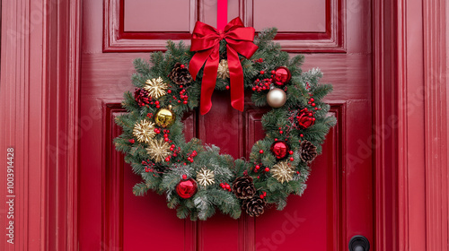© Mirjana, Naklejka premium A festive wreath adorned with ornaments and natural elements hangs on a bright red door during the holiday season