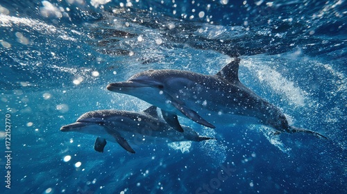 © Anna, Obraz premium A few dolphins swim in a water body with bubbles at its bottom and surface