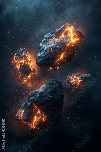 Naklejka premium A few floating rocks in space with glowing orange cracks, a black color...