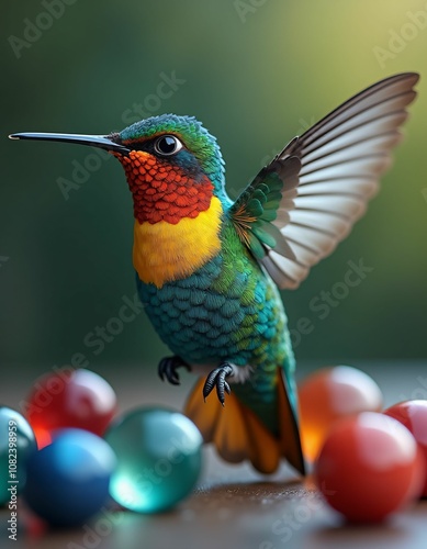 Obraz premium a few marbles and a colorful hummingbird, blue, yellow, green, green, red, realistic, detailed
