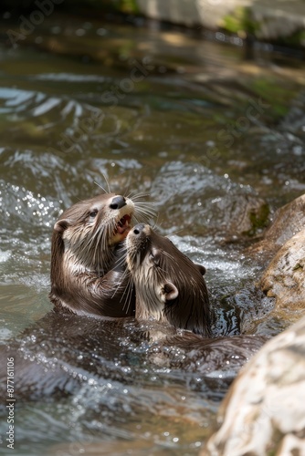 © Viktor, Fototapeta premium A few otters frolic in the water, engaging with one another, surrounded by a backdrop of submerged rocks