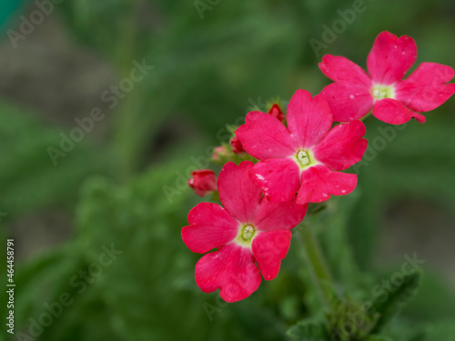 © Oleksii, Obraz premium A few pink verbena flowers on a blurry green background.