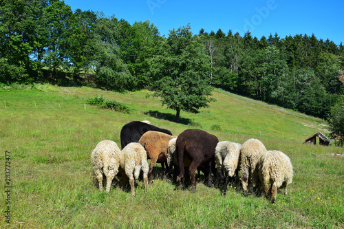 © Susanne Fritzsche, Obraz premium A few sheep from behind grazing in a meadow in Bavaria.