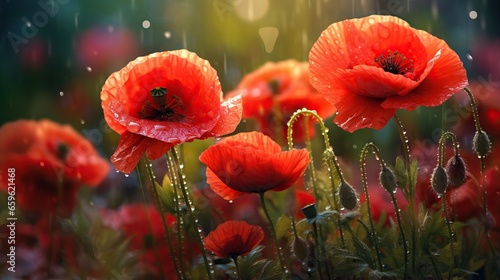 © Anna, Fototapeta premium a field full of red flowers with water droplets on them. generative ai