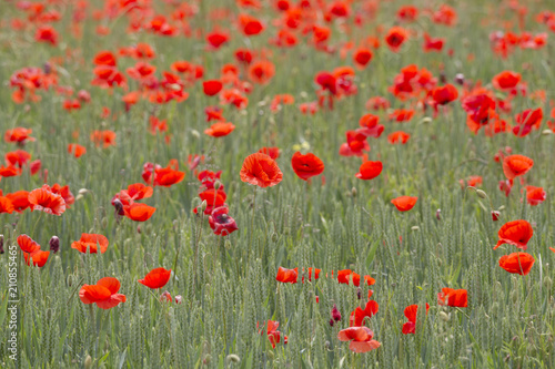 © were, Fototapeta premium A field full of red poppy flowers between grasses at the edge of the forest