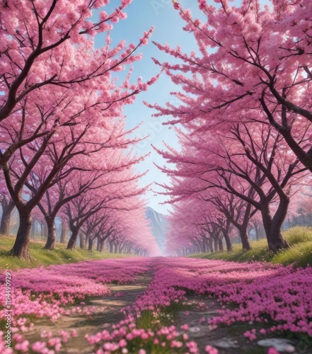 © Prasert, Obraz premium A field of blooming cherry blossom trees with vibrant pink flowers and soft focus effect, soft focus, natural beauty