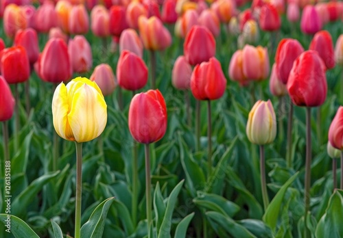 © SKIMP Art, Fototapeta premium A field of colorful tulips in full bloom, with reds and oranges contrasting against the green grass background The focus is on one bright yellow tulip among the other tulip flowers Generative AI