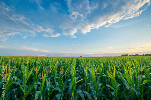 © mila103, Obraz premium A field of corn is shown with a clear blue sky in the background