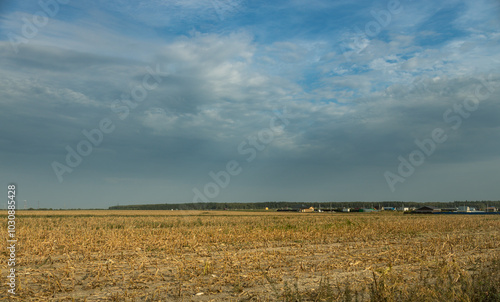 © Sergei, Obraz premium A field of corn is shown with a cloudy sky in the background