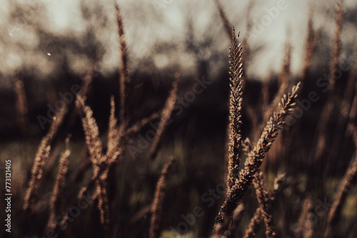 © oybekostanov, Fototapeta premium A field of dry grass with a few trees in the background