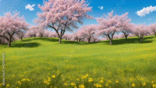 Obraz premium A Field Of Flowers And Trees With A Blue Sky