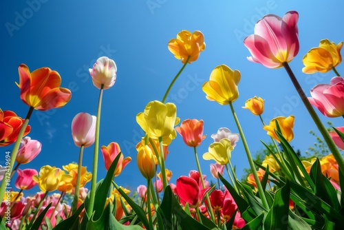 © ZeeZaa, Fototapeta premium A field of flowers with a blue sky in the background