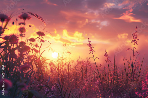 © mila103, Fototapeta premium A field of flowers with a bright orange sun in the sky