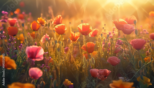 © yurakrasil, Obraz premium A field of flowers with a bright sun shining down on them