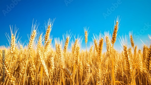Fototapeta premium 175. **A field of golden wheat ready for harvest with a clear blue sky.