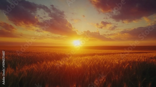 © liliyabatyrova, Fototapeta premium A field of golden wheat with a bright orange sun in the sky