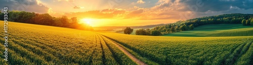 © jiawei, Obraz premium A field of grass with a sun shining through the clouds