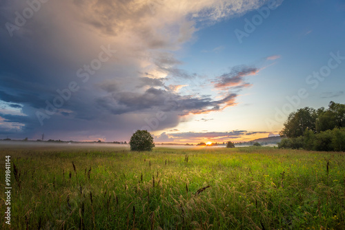 © Sergei, Obraz premium A field of grass with a tree in the middle and a cloudy sky in the background
