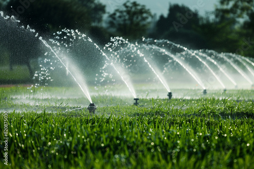 © lashkhidzetim, Naklejka premium A field of grass with sprinklers in the background