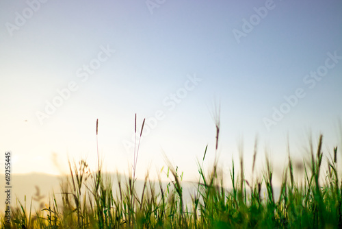 Fototapeta premium A field of grass with the sun shining on it. landscape suitable for writing area