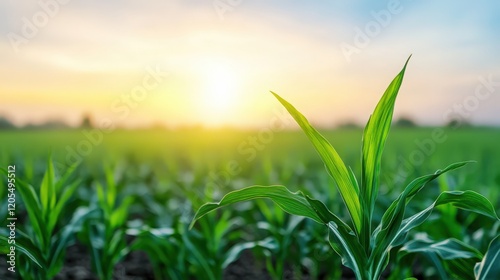 Fototapeta premium A field of green corn with a sun shining on it