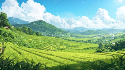 © Korawan, Fototapeta premium A field of green grass with a house in the distance