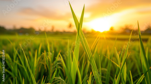© wanchai, Fototapeta premium A field of green grass with a sun in the sky